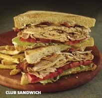 ◇クラブサンドイッチ◇薄くスライスしたグリルチキン6ozを、レタス、トマト、ベーコンと一緒に厚くカットしたブレッドで挟みました。フライドポテトとコールスロー付。